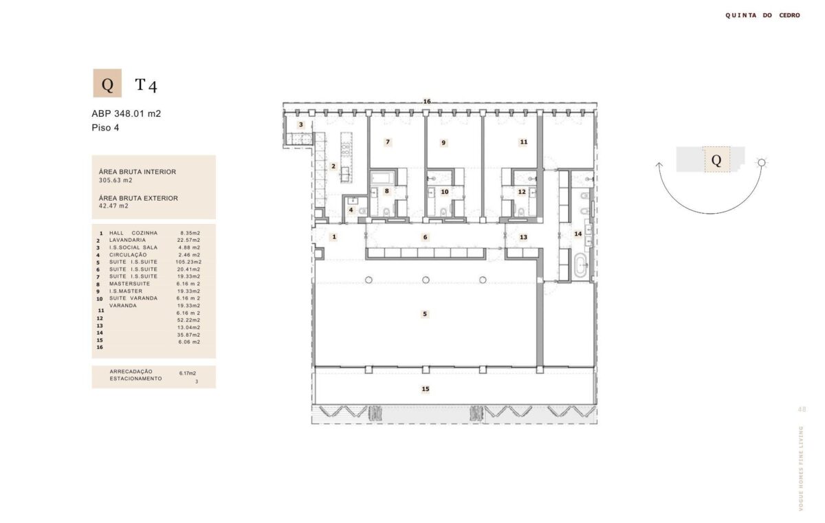 Este apartamento de una planta se encuentra en la cuarta planta del desarrollo Quinta do Cedro y ofrece 305,63 metros cuadrados de espacio interior. La propiedad está orientada al sur y cuenta con 5 baños completos, proporcionando amplitud y comodidad para toda la familia.