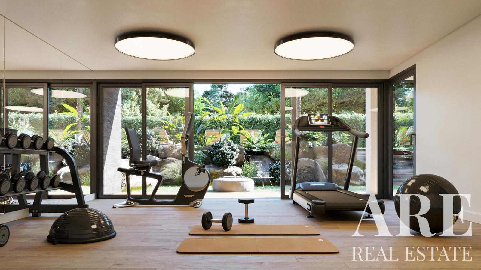 El edificio está equipado con un gimnasio completo, que incluye máquinas de fitness y mancuernas. La seguridad está asegurada con un sistema de alarma, y la propiedad cuenta con paneles solares para el calentamiento de agua, lo que mejora la eficiencia energética. El apartamento tiene una calificación energética de A, lo que indica una buena eficiencia. Además, hay un garaje con espacio para cuatro vehículos.