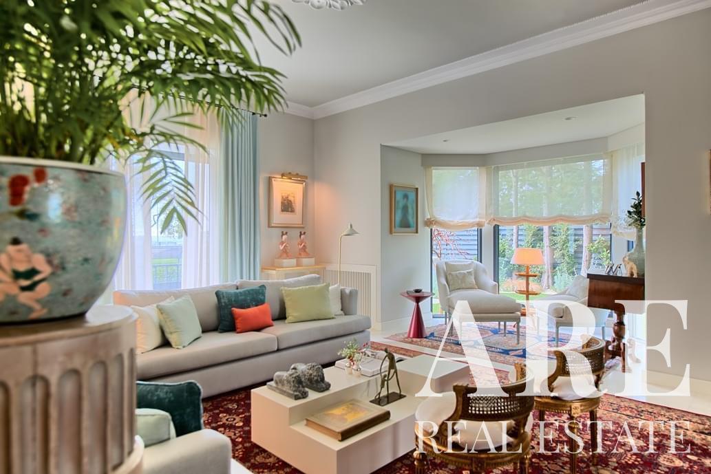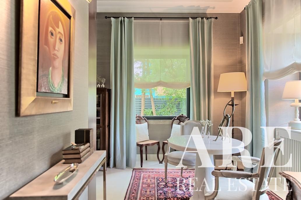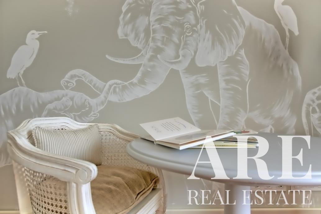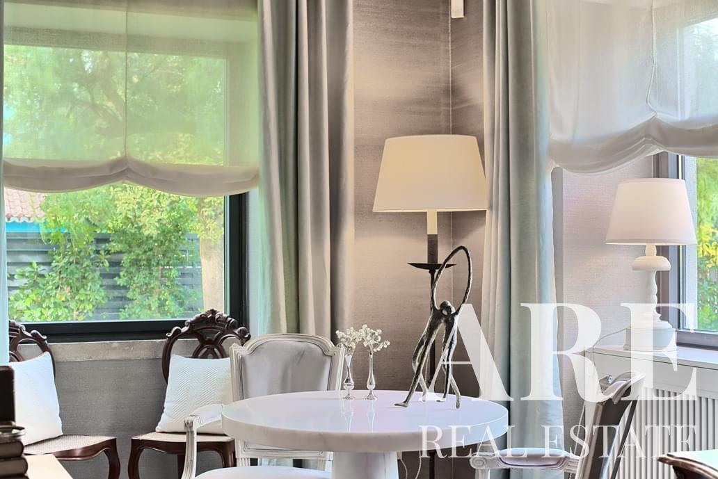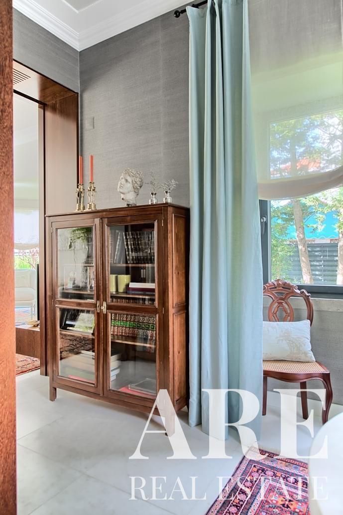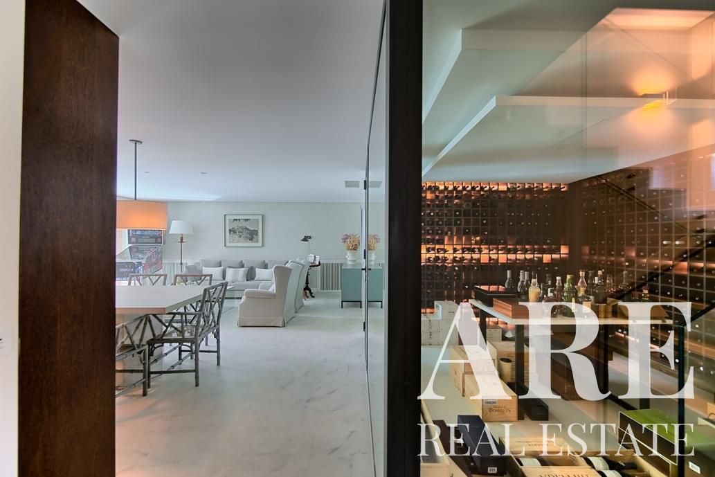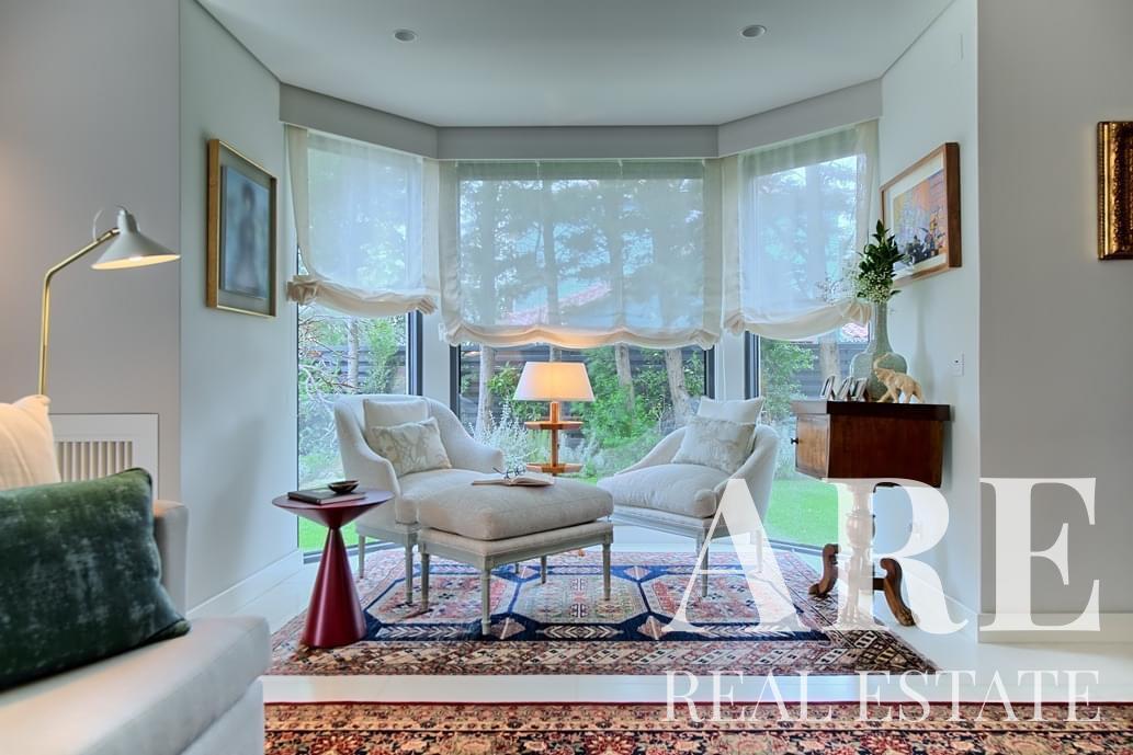 La villa ofrece amplias áreas de estar, incluida una gran suite principal, varios dormitorios, una biblioteca y una bodega. También dispone de un ascensor, piscina climatizada, calefacción central con suelo radiante y paneles solares para eficiencia energética.