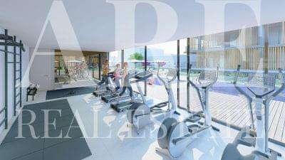 L’appartement comprend une piscine extérieure et des terrasses, idéales pour se détendre et profiter de l’extérieur. Le jardin ajoute une touche de verdure et de tranquillité. Pour les amateurs de sport, un gymnase équipé de machines de fitness est à disposition. Le bien dispose également de panneaux solaires pour le chauffage de l’eau, contribuant à une efficacité énergétique de classe A.