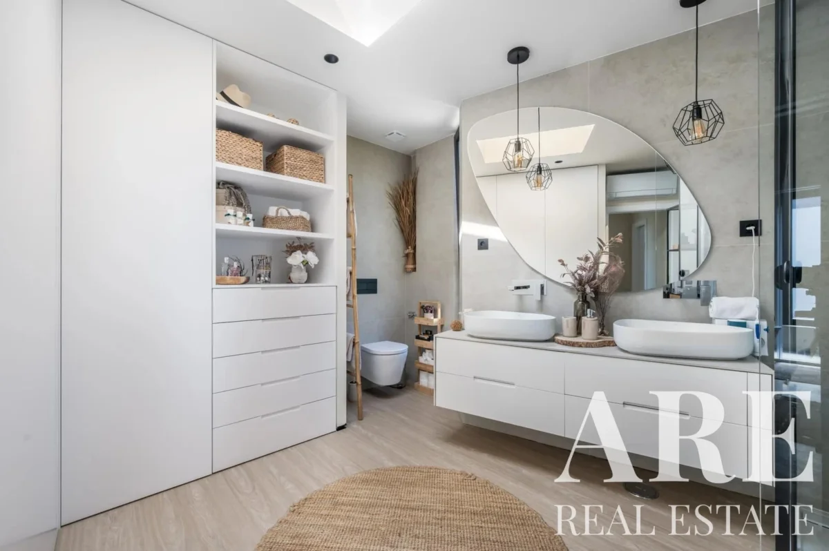 Cette villa comprend une surface intérieure de 151,14 m² et est située sur un terrain de 321,1 m². Elle est construite sur deux étages et dispose de 4 salles de bains. Les espaces extérieurs incluent des balcons et terrasses, ainsi qu’une piscine extérieure et un jardin. La villa est équipée de panneaux solaires pour le chauffage de l’eau, ce qui contribue à son efficacité énergétique de classe A.