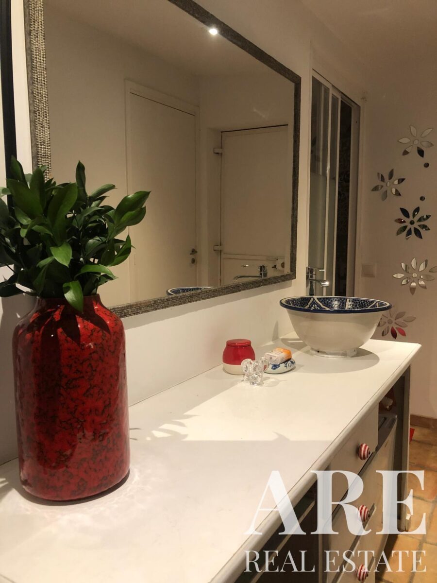 L’espace extérieur constitue un atout majeur avec son jardin privé, complété par plusieurs balcons et terrasses qui permettent de profiter pleinement de la vue mer et du climat méditerranéen. L’orientation sud de la propriété garantit un ensoleillement optimal dans tous les espaces de vie. La classification énergétique E indique une efficacité énergétique correcte qui peut souvent être améliorée avec des améliorations mineures.