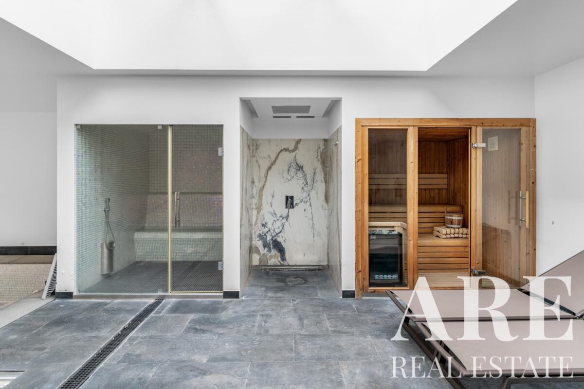 The building offers premium amenities including an indoor heated pool, gymnasium equipped with fitness machines, and spa facilities with sauna and Turkish bath. The apartment includes one garage space and one storage room. The property features underfloor heating throughout, an alarm system for security, and solar panels for water heating.
