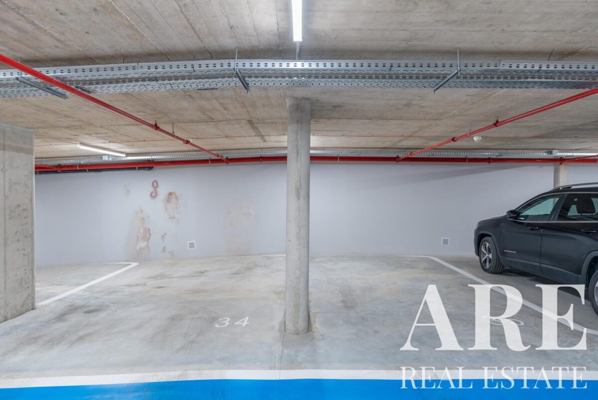 This single-storey apartment spans 88 square meters of interior space and was completed in 2024. The property features modern amenities, including air conditioning and underfloor heating throughout, along with solar panels for water heating. The apartment includes 14 square meters of balconies and comes with one garage space.