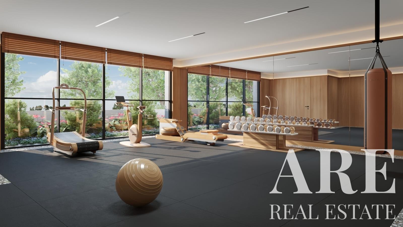 The property features an outdoor heated pool and balconies totalling 31.2 square meters, perfect for enjoying the east-facing garden views. It also includes a gymnasium equipped with fitness machines, ensuring residents have access to excellent recreational facilities. The apartment is air-conditioned and utilises solar panels for water heating, contributing to its A+ energy rating, which indicates excellent efficiency.