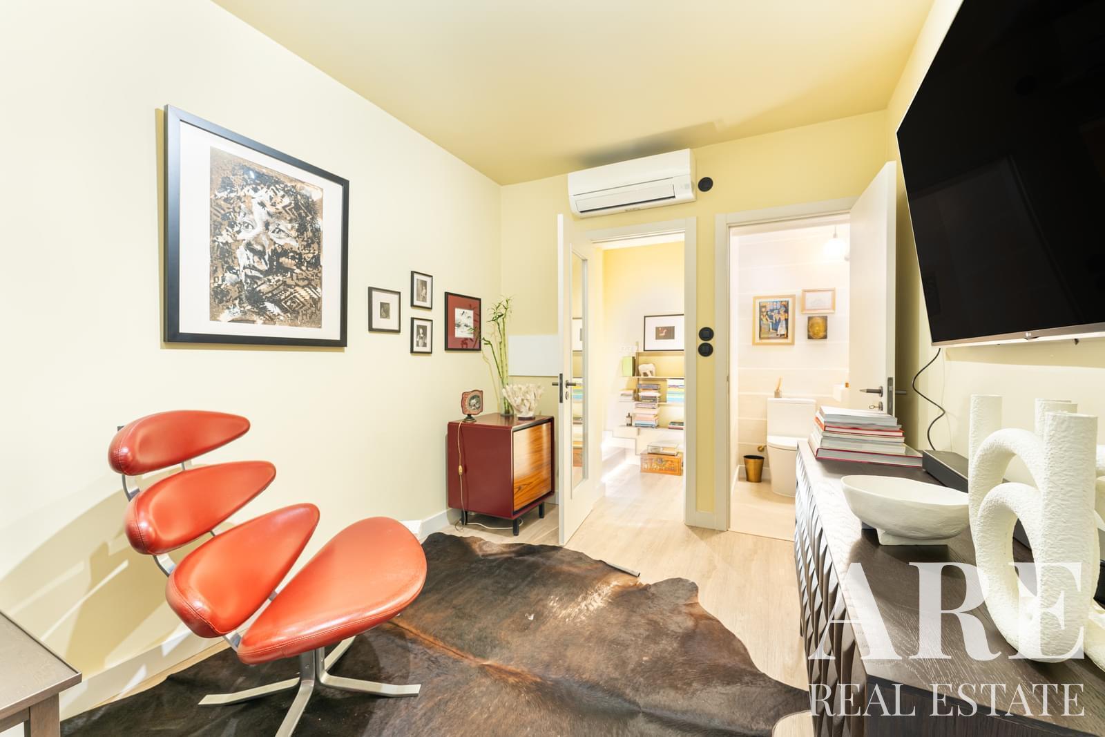The apartment includes a fully equipped BOSCH kitchen, dining area with access to a 17 m² terrace, laundry space, and a private entry via a service corridor. It features one bedroom with a built-in wardrobe and A/C, a living room, two bathrooms, and an 11.5 m² office/studio with independent street access—perfect for working from home or running a small business.