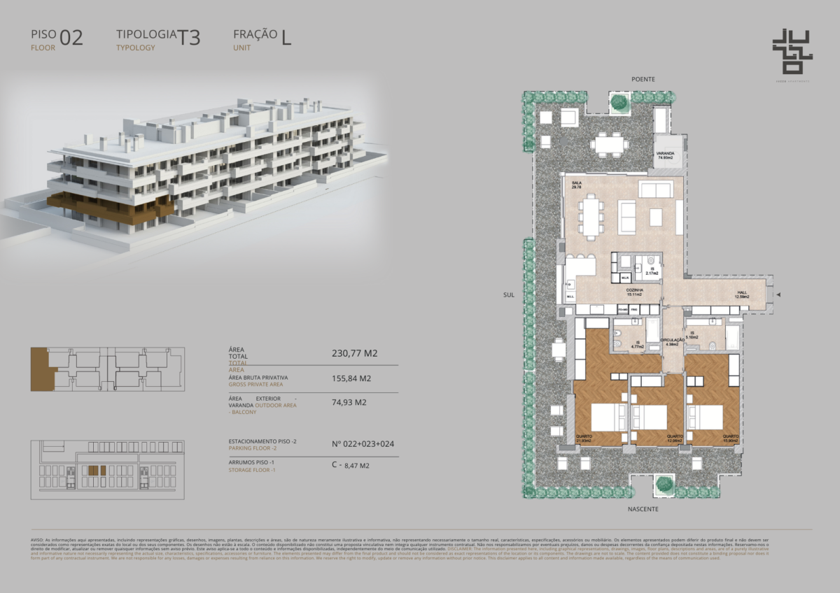 Apartment for sale located in Aldeia de Juzo, Cascais, Lisbon. This premium 3-bedroom, 2-bathroom apartment belongs to the JUZZO APARTMENTS development and is a single-storey unit on the second floor, with a total interior area of 155.84 m². The property offers a garden view, south-west facing orientation, balconies, an outdoor heated swimming pool, three garage spaces, one storage room, lift access, air conditioning, CCTV security, solar panels for water heating, electrical shutters in every room, and a gymnasium equipped with fitness machines and dumbbells. The property is held under full ownership. Available for sale with Lisbon Property for the asking price of € 1 350 000.
