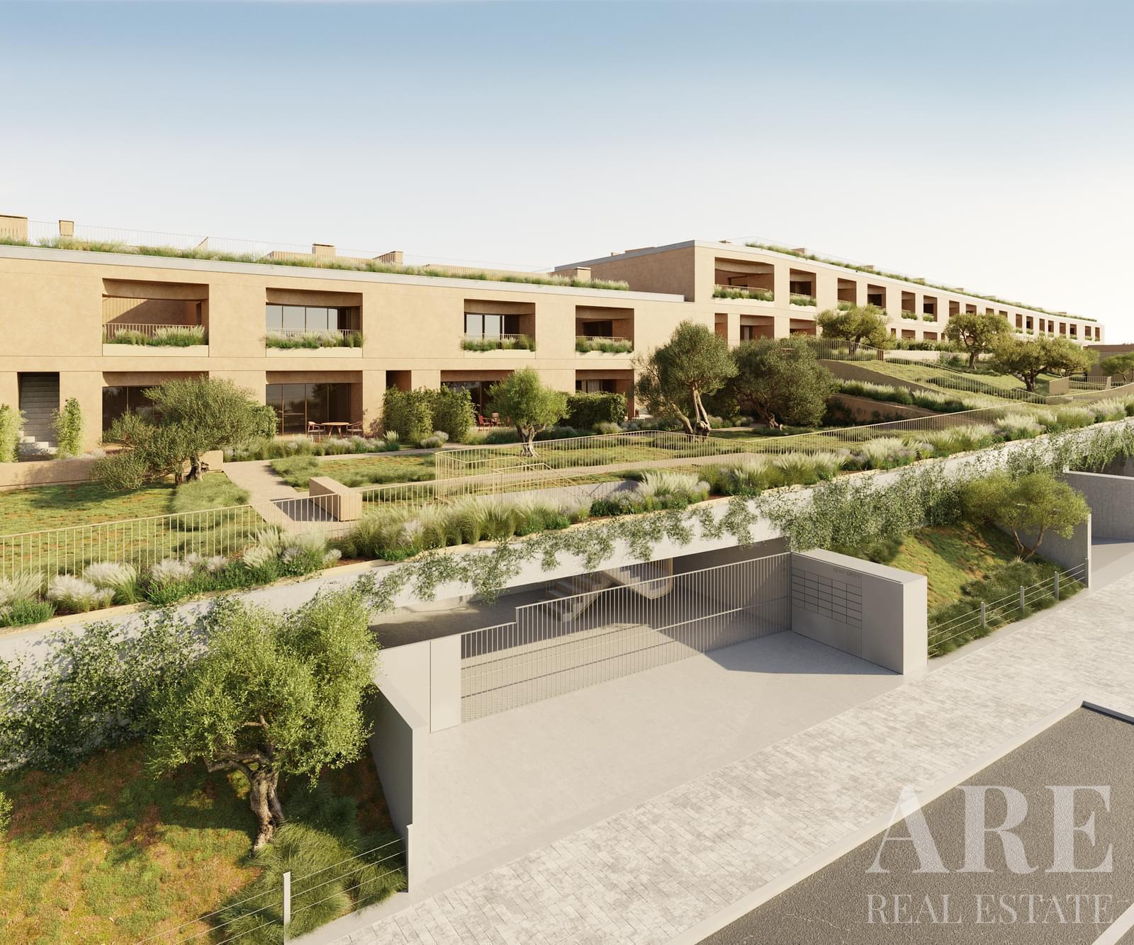 Apartment for sale in Olive Green condominium, located in Alcacer do Sal. This mid-market 2-bedroom, 2-bathroom single-storey apartment is situated on the ground floor and has an interior area of 86.0 m². The property features a garden view, south-facing terraces, a private garage for two cars, and a storage room. It includes access to an outdoor pool, air conditioning, solar panels for water heating, and a gym equipped with fitness machines. With a construction year of 2027 and full ownership, this apartment is available with Lisbon Property for the asking price of € 469 350.