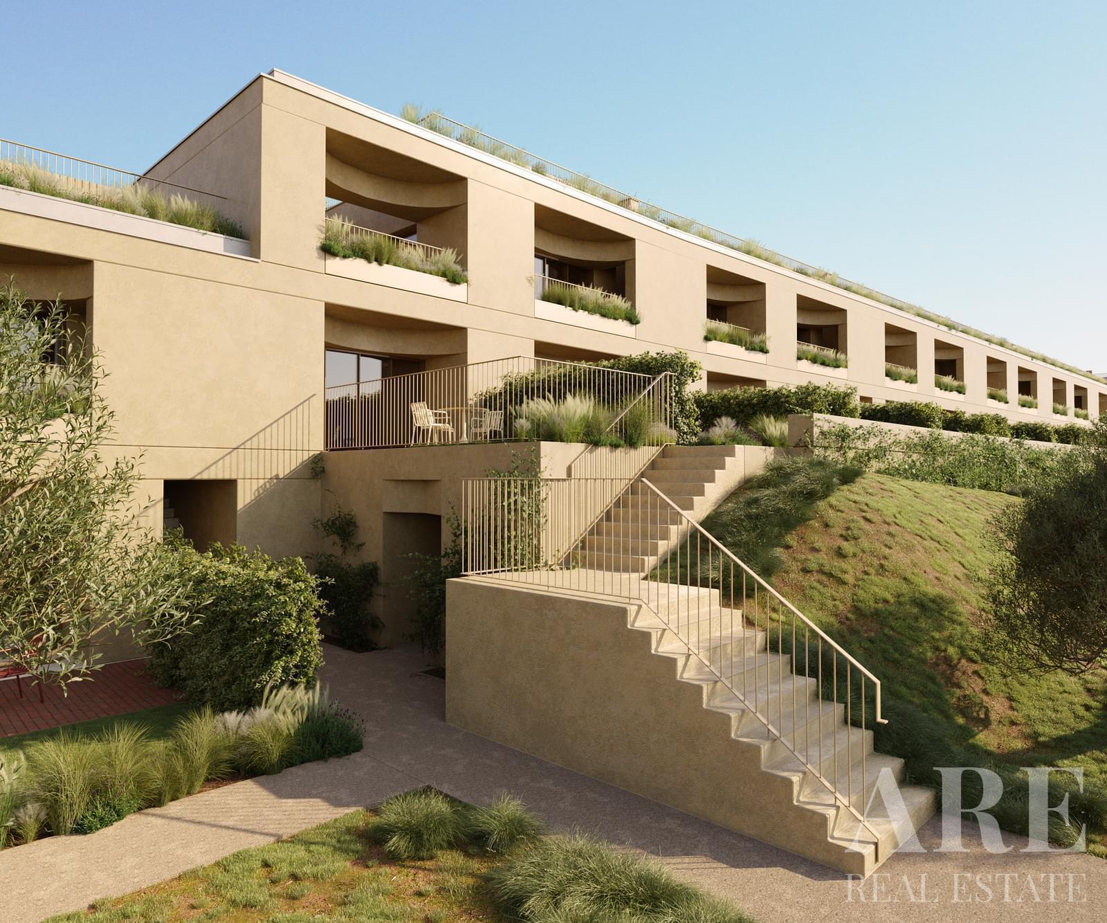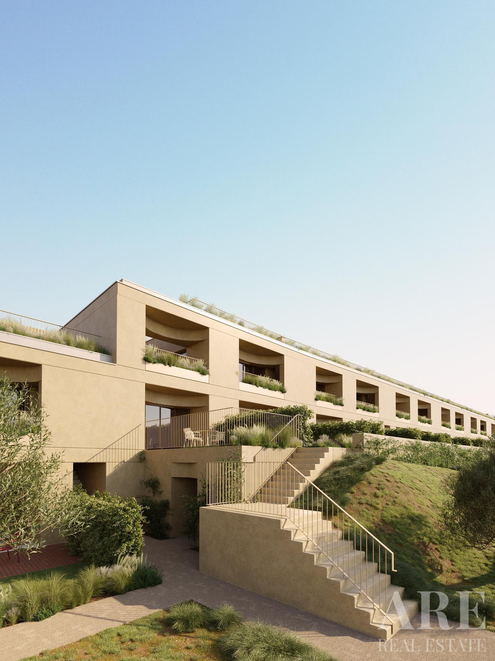 Apartment for sale in Olive Green condominium, located in Alcacer do Sal. This upper-market 2-bedroom, 2-bathroom single-storey apartment is situated on the ground floor and has an interior area of 86.0 m². The property features a garden view, south-facing terraces, a garage for two cars, and a storage room. It includes access to an outdoor pool, air conditioning, solar panels for water heating, and a gym equipped with fitness machines. With a construction year of 2027 and full ownership, this apartment is available with Lisbon Property for the asking price of € 469 350.