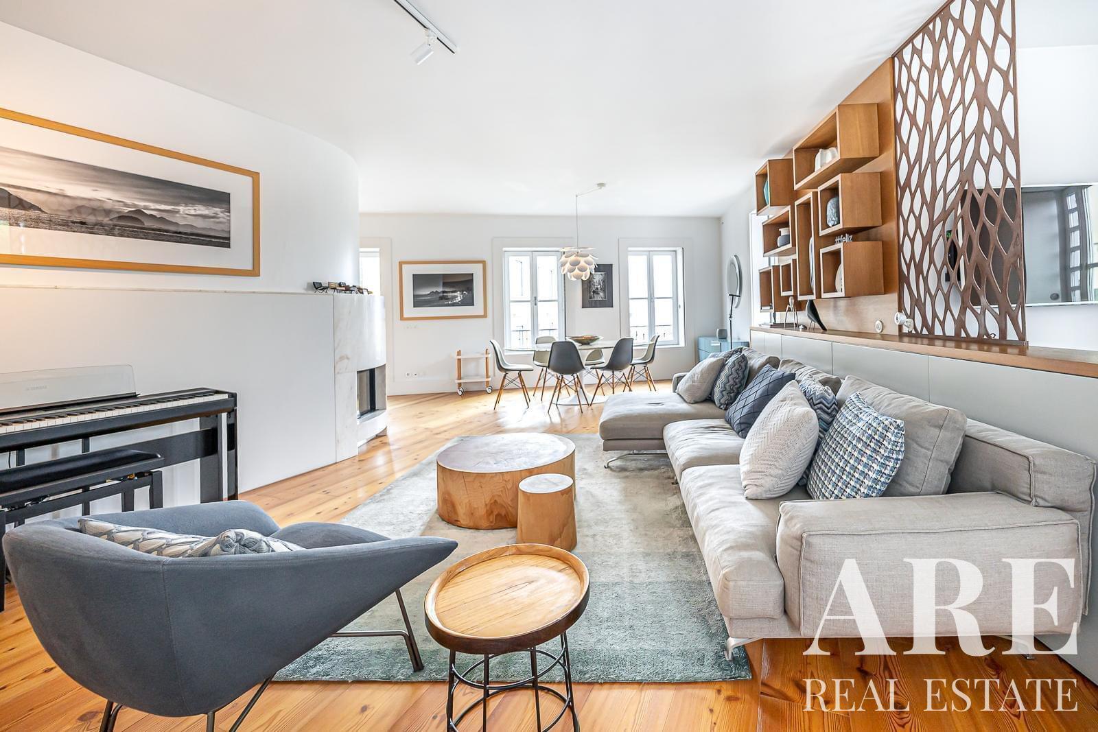 This stunning T2 luxury apartment is located near the Sé Cathedral. Set in an exclusive building with only three apartments, it offers 162 m² of living space. The apartment features a spacious living and dining room with a cosy fireplace, a modern kitchen with high-end appliances, and a private terrace. It has two bedrooms, including a master suite, and a second bathroom with a shower. The apartment also includes a parking space and storage.