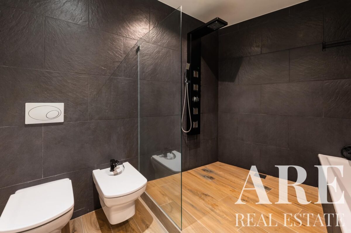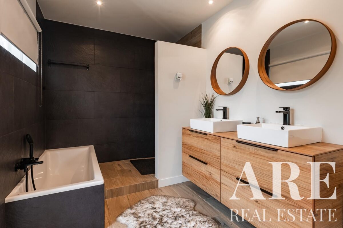 The villa comprises 4 bathrooms and is fully air-conditioned, with a fireplace for added comfort. Solar panels are installed for water heating, contributing to energy efficiency. The energy rating is C, indicating good efficiency with potential for improvement through minor upgrades.