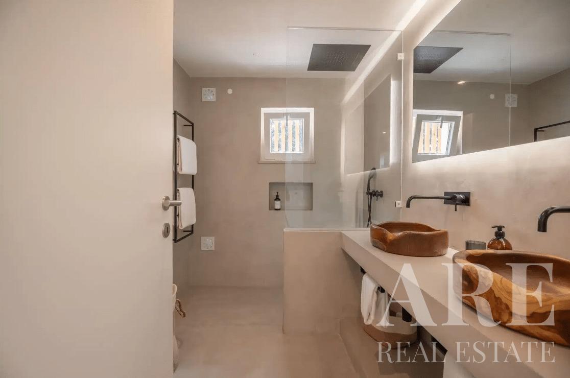 Additional highlights include air conditioning throughout (Whirlpool), elegant microcement flooring, Bosch appliances (AEG induction hob), LED-lit bathroom mirrors, and a water heater.
