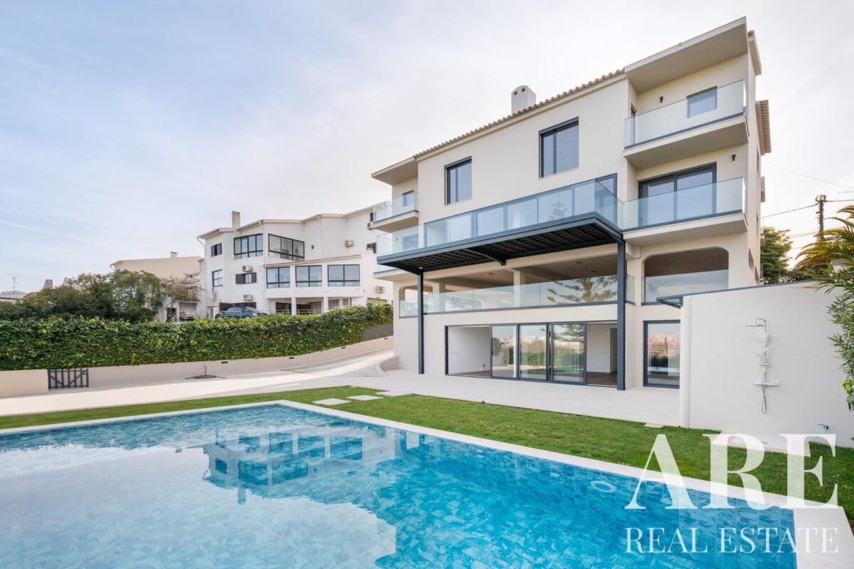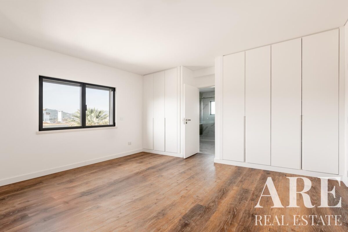 O exterior apresenta uma piscina exterior e jardim privativo, complementados por amplas áreas de estacionamento que incluem garagem para dois veículos e estacionamento exterior adicional. A propriedade dispõe ainda de um espaço de arrumos e painéis solares para aquecimento de água, demonstrando eficiência energética. Todos os quartos estão equipados com estores elétricos para maior conforto e privacidade.