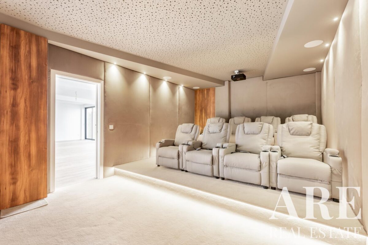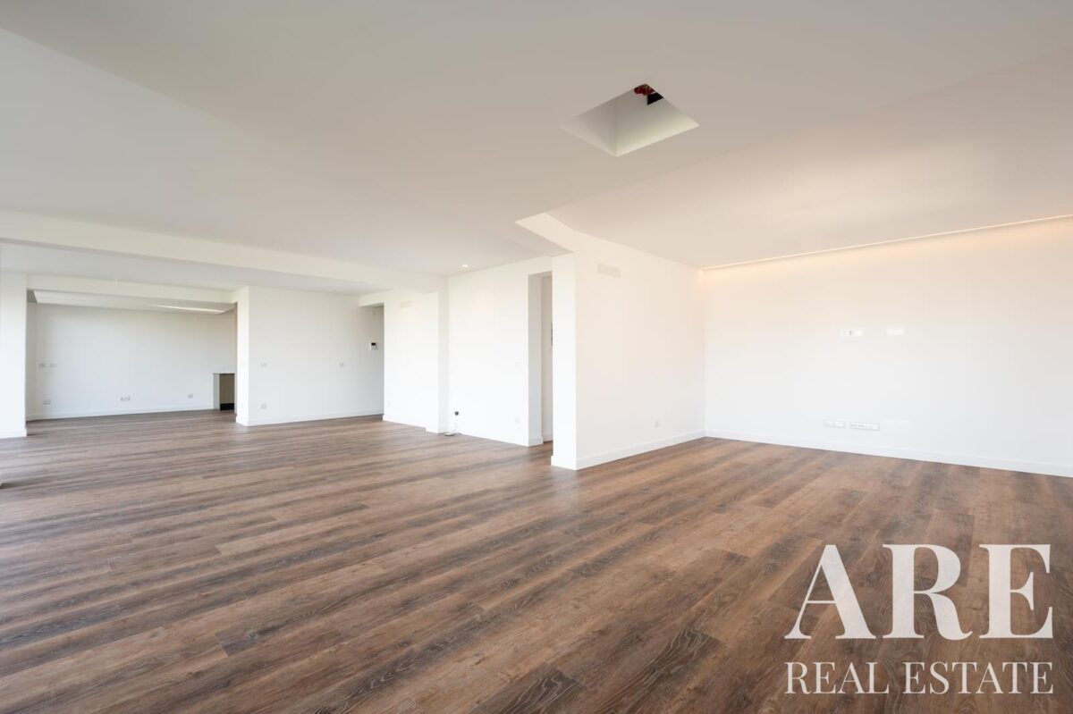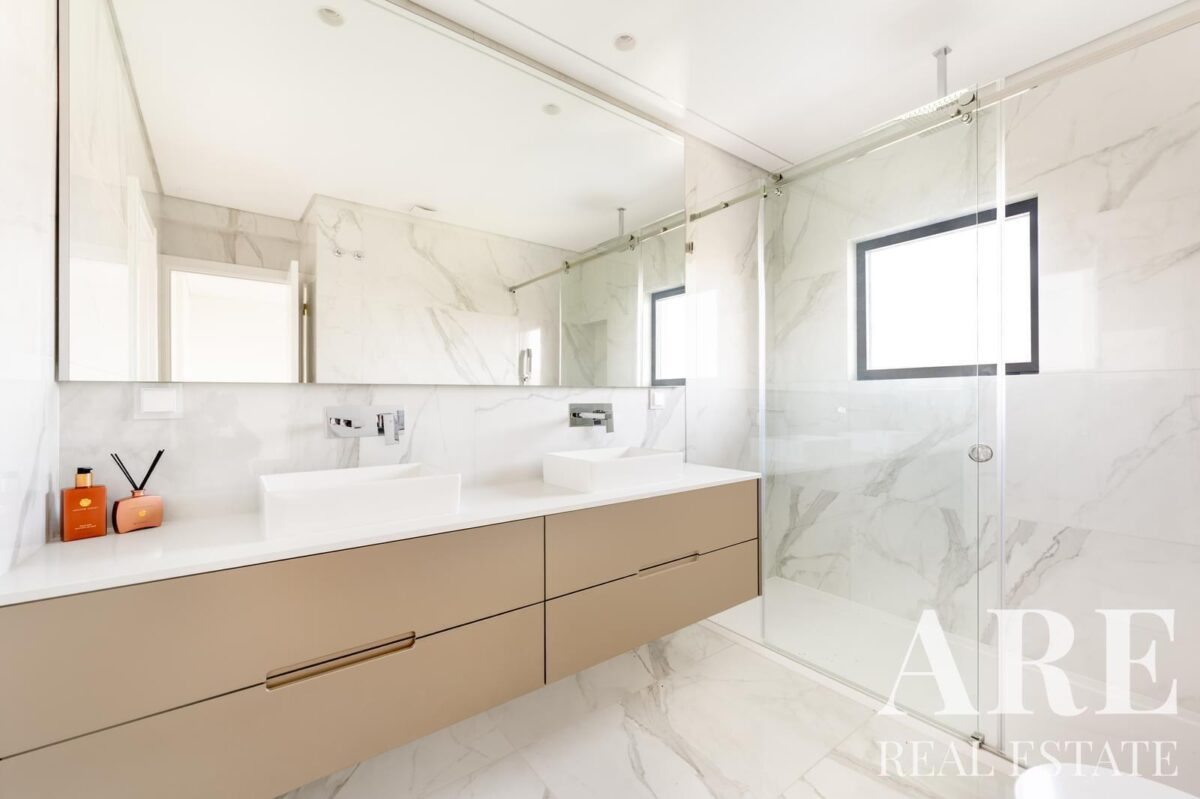 Esta propriedade de luxo estende-se por quatro níveis, incluindo cave, rés-do-chão, primeiro andar e terraço, oferecendo 382 metros quadrados de área interior num lote de 802 metros quadrados. A moradia conta com oito casas de banho completas e múltiplas varandas e terraços que maximizam o aproveitamento do espaço exterior.